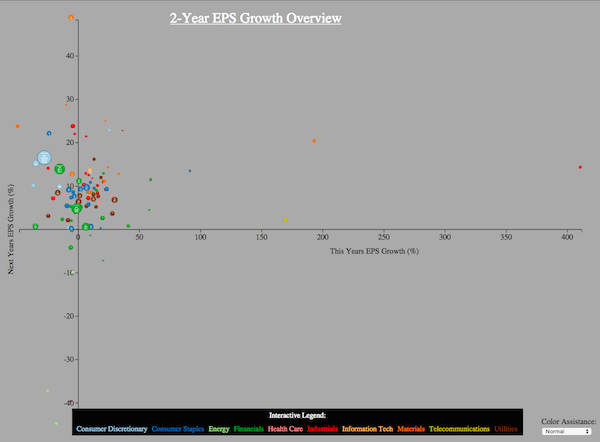 The size of each circle represents the companies current Earnings Per Share (EPS). Some interactivity features include panning, zooming, and clicking each circle to bring them to the foreground.